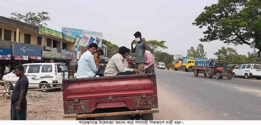হবিগঞ্জের শায়েস্তাগঞ্জে নিষেধাজ্ঞার মাঝেও পিকআপ ভ্যানে যাত্রী বহন!