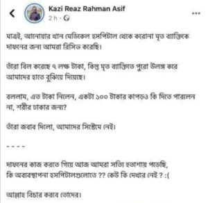 ঠিক তেমনি আরেকটি খবর ভাইরাল হয়েছে সামাজিক যোগাযোগ মাধ্যমের দুনিয়ায়। ঘটনাটি ঘটেছে ঢাকার আনোয়ার খান মেডিকেল হাসপাতালে। কাজী রিয়াজ রহমান আসিফ নামে এক ভুক্তভোগীর ভাইরাল হওয়া স্ট্যাটাসে তিনি উল্লেখ করেন উনার নিকট আত্মীয় আনোয়ার খান মেডিকেল হাসপাতালে কোরোনায় মারা গেলে, কোরোনা চিকিৎসা বাবদ ৭ লক্ষ টাকা পরিশোধ করার পর লাশ দেয়ার সময় লাশ কে সম্পূর্ণ উলঙ্গ অবস্থায় তাদের কাছে হস্তান্তর করে। এ সম্পর্কে ভুক্তভোগীরা কর্তৃপক্ষ কে প্রশ্ন করেন, আমরা ৭লক্ষ টাকা বিল পরিশোধ করলাম আর আপনারা লাশের উপর একটা ১০০ টাকার কাপড় ও দিতে পারলেন না ? হাসপাতাল কর্তৃপক্ষ বলে, এটা তাদের সিস্টেমে নাই !