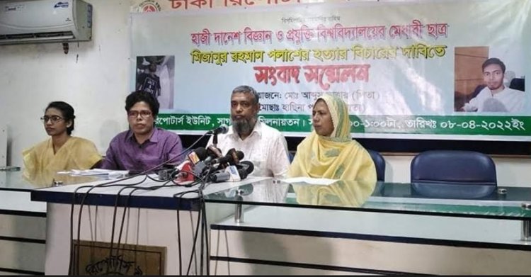 হাজী মোহাম্মদ দানেশ বিজ্ঞান ও প্রযুক্তি বিশ্ববিদ্যালয়ের (হাবিপ্রবি) ছাত্র মিজানুর রহমান পলাশকে হত্যা করা হয়েছে বলে দাবি করেছেন তার স্বজনেরা। এই ‘হত্যাকাণ্ডের’ সুষ্ঠু তদন্ত এবং বিচার চেয়ে সংবাদ সম্মেলন করেছেন তার বাবা ও মা। আজ শুক্রবার সকালে রাজধানীর সেগুনবাগিচায় ঢাকা রিপোর্টার্স ইউনিটি (ডিআরইউ) সাগর-রুনি মিলনায়তনে ওই সংবাদ সম্মেলন হয়।