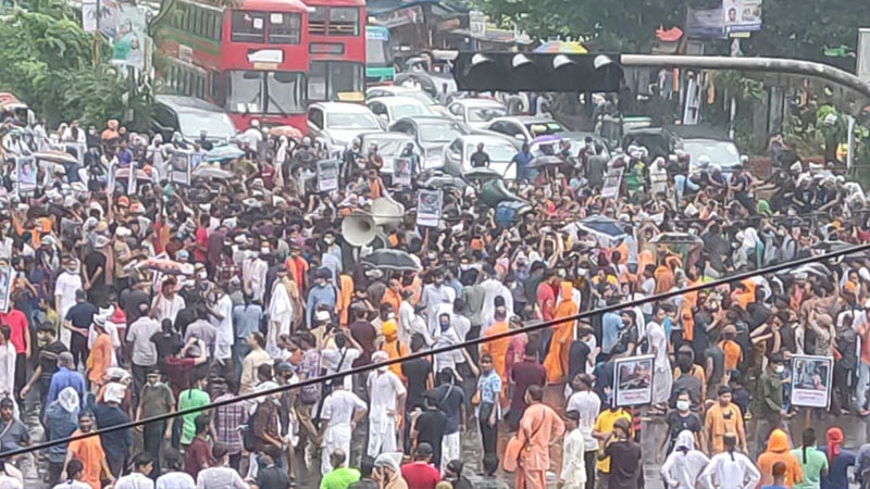 রাজধানীর শাহবাগ মোড়ে সড়ক অবরোধ করে বিক্ষোভ করেছে হিন্দু সাম্প্রদায়িক সংগঠন ইসকনের স্বামীবাগ আশ্রম এবং ঢাকা বিশ্ববিদ্যালয় শাখা।