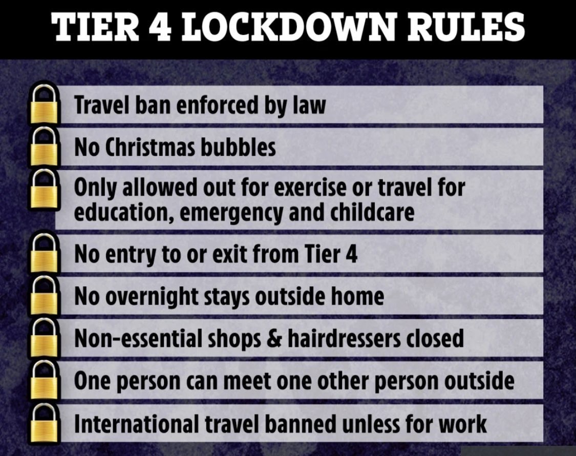 শনিবার বিকার ৪টায় পূর্ব নির্ধারিত এক সংবাদ সম্মেলনে নতুন এই পদক্ষেপের কথা ঘোষণা করেছেন প্রধানমন্ত্রী বরিস জনসন। সাংবাদিকদের প্রশ্নের জবাবে তিনি বলেন, করোনা ভাইরাসের নতুন একটি রূপান্তরিত রূপ ছড়িয়ে পড়ছে। এটি যে হারে ছড়িয়ে পড়ছে তা এড়িয়ে যাওয়া সম্ভব নয়। ভাইরাস যেহেতু তার আক্রমণের ধরণ পাল্টেছে তাই আমাদেরকেও এখন প্রতিরোধের ধরণ পাল্টাতে হবে। বক্তব্যে বরিস জনসন বলেন, নতুন বাধানিষেধের আওতায় থাকা এলাকাগুলোর বাসিন্দাদের অবশ্যই নিজ নিজ বাসায় অবস্থান করতে হবে।জরুরি প্রয়োজন ছাড়া কোনো ধরণের কার্যক্রম চালু থাকবে না। মানুষ অকারণে বাসার বাইরেও যেতে পারবে না। মানুষকে বাসায় বসে কাজ করার আহবান জানিয়েছেন বরিস জনসন। তবে নির্মান শ্রমিক ও এ খাতের সঙ্গে সংশ্লিষ্টদের কর্মক্ষেত্রে যাওয়ায় কোনো নিষেধাজ্ঞা থাকছে না। টিয়ার ৪ যেসব এলাকায় ঘোষণা করা হয়েছে সেখানে বাইরে থেকে প্রবেশ না করার আহবান জানিয়েছেন বরিস জনসন। এই কড়াকড়ি দুই সপ্তাহের জন্য ঘোষণা করা হয়েছে। আগামী ৩০শে ডিসেম্বর এটি আবারো পর্যালোচনা করে দেখা হবে।