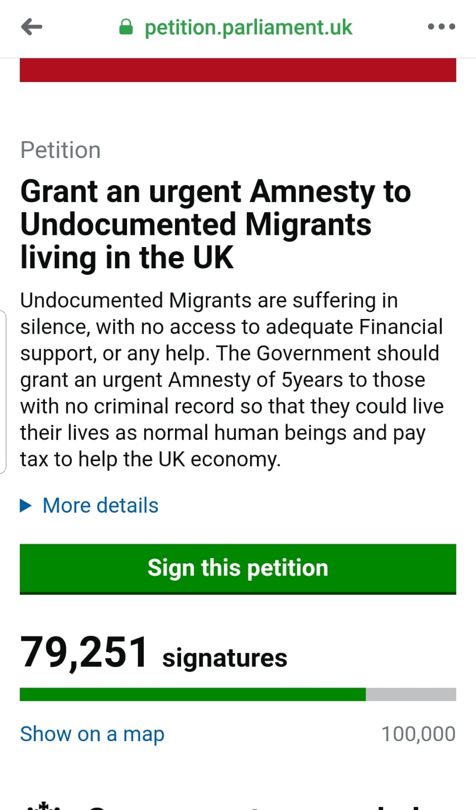 ব্রিটেনে বৈধ কাগজপত্রবিহীনদের বৈধতার দাবীতে করা ইপিটিশনে বরাবরের মতো আবারও ব্যাপক জনসমর্থন পাওয়া যাচ্ছে , মাত্র কয়েক কয়েক মাসের মধ্যেই প্রথমবারের মতো বর্তমান ইপিটিশনটিতে প্রায় ৮০ হাজার সাইন হয়েছে , পার্লামেন্টে বিতর্কের জন্য ১ লক্ষ সাইন প্রয়োজন তাই সবাইকে অতিদ্রুত পিটিশনটি সাইন করার অনুরোধ করা হচ্ছে